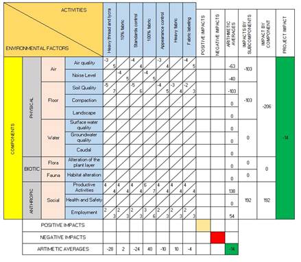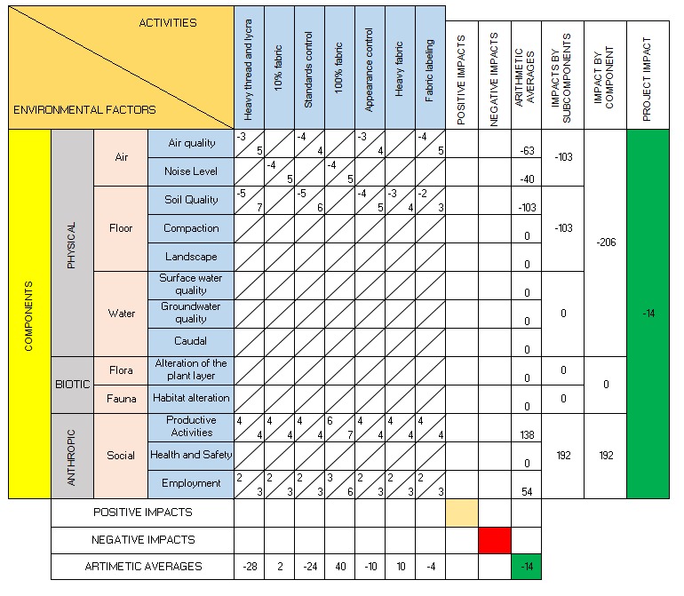On the other hand, the Leopold Matrix is an environmental assessment tool that enables the analysis and quantification of impacts associated with the activities of a production process. After developing a detailed diagram that identifies inputs, outputs, environmental aspects, and impacts in the weaving process of a textile company, the application of this matrix allows for a deeper identification of the most significant impacts.