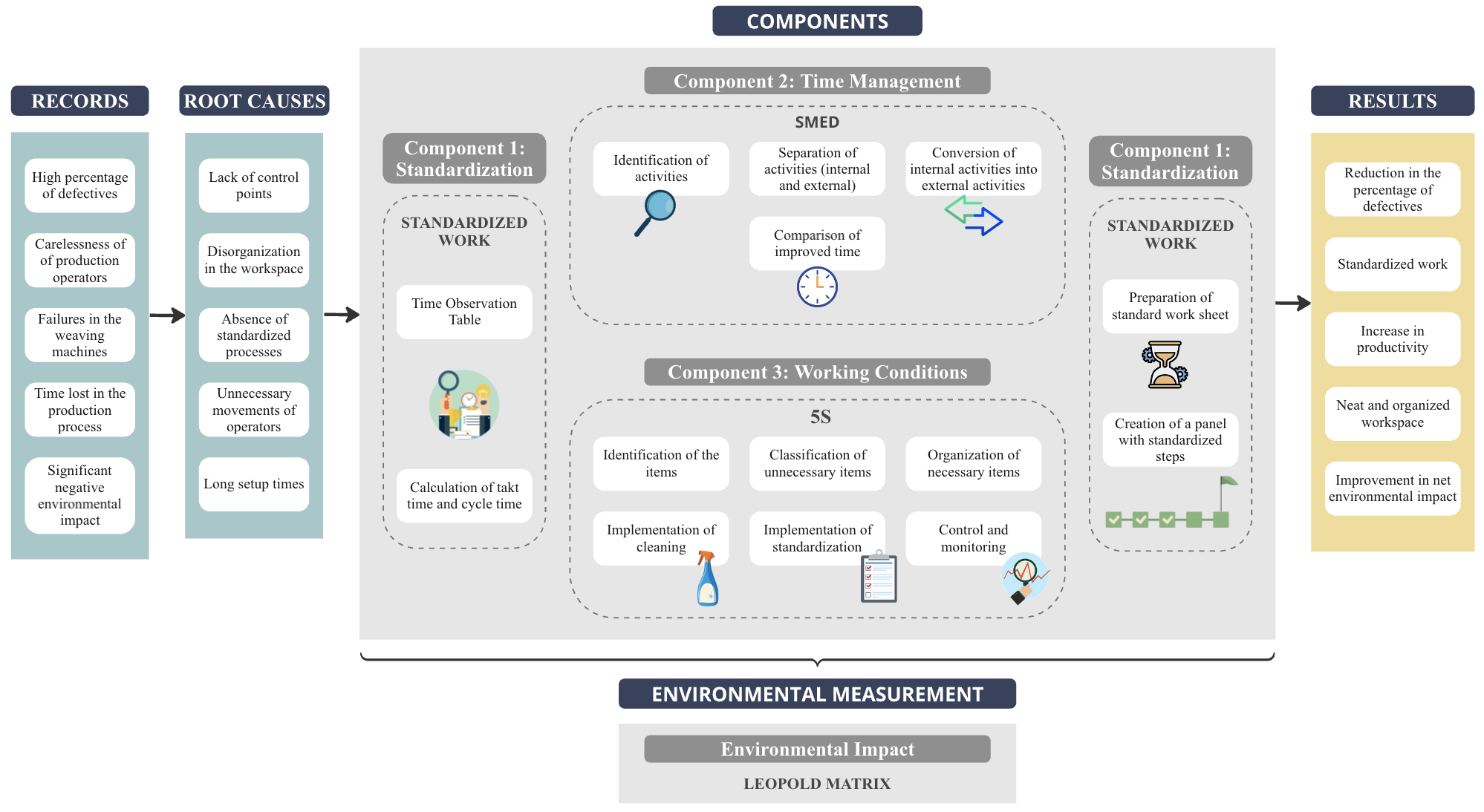 It is concluded that the development of the state of the art made it possible to clearly identify the main challenges that the company faced prior to the implementation of improvement initiatives. Among these challenges, the reduction of fabric defects in the production process emerged as the most critical issue, directly influencing efficiency, cost structures, and customer satisfaction. By establishing a comprehensive diagnosis, the study provided a solid foundation upon which to design a management model capable of addressing these shortcomings through the integration of Lean Manufacturing tools such as SMED, standardized work, and 5S. This approach highlights the importance of evidence-based decision making in industrial contexts: before any improvement strategy can be applied, it is necessary to understand in detail the weaknesses, inefficiencies, and environmental impacts embedded within the production process. Environmentally, the net impact value improved significantly, from an initial score of -258 to -14, reflecting a substantial reduction in environmental impact.